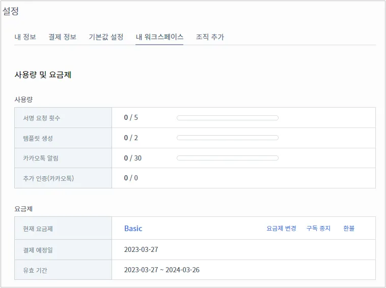 [내 워크스페이스] 탭을 클릭하고 [사용량 및 요금제] 화면에서 [요금제]-[환불]을 클릭합니다.