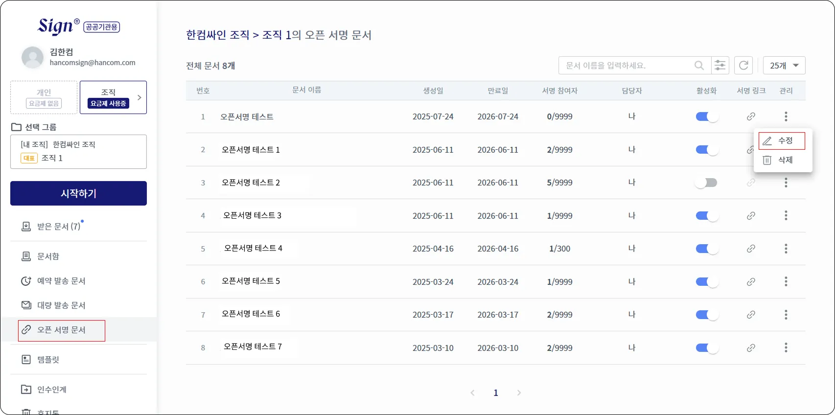 표시된 오픈서명 목록중 편집하고자 하는 오픈서명 오른쪽 끝의 [관리] 아이콘을 클릭 하고 [수정]를 클릭 합니다.