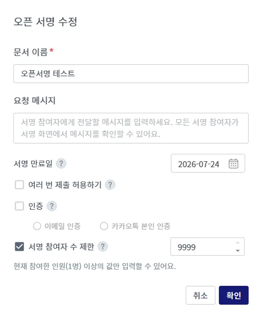 서명 참여자 수 제한: 서명 문서마다 최대 참여자 수를 입력 여부를 결정하고, 인원 수를 지정합니다.