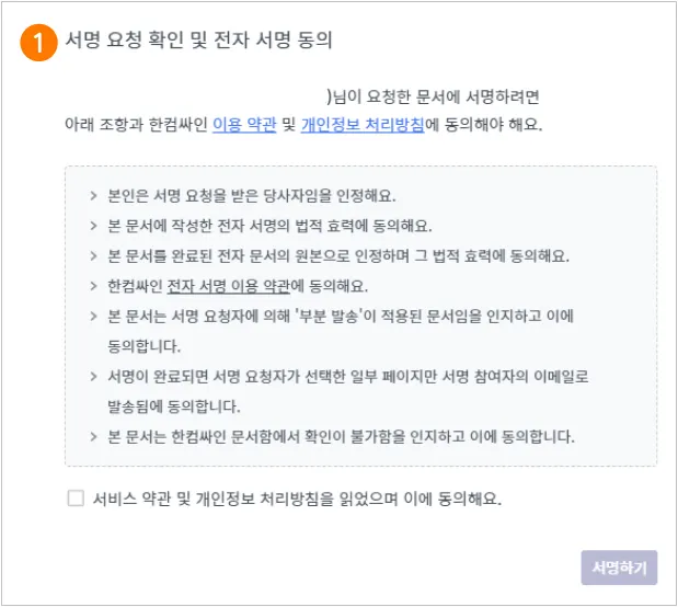 내용 숙지 후, 동의 체크박스에 체크 하거나 [서명하기] 버튼을 클릭합니다.