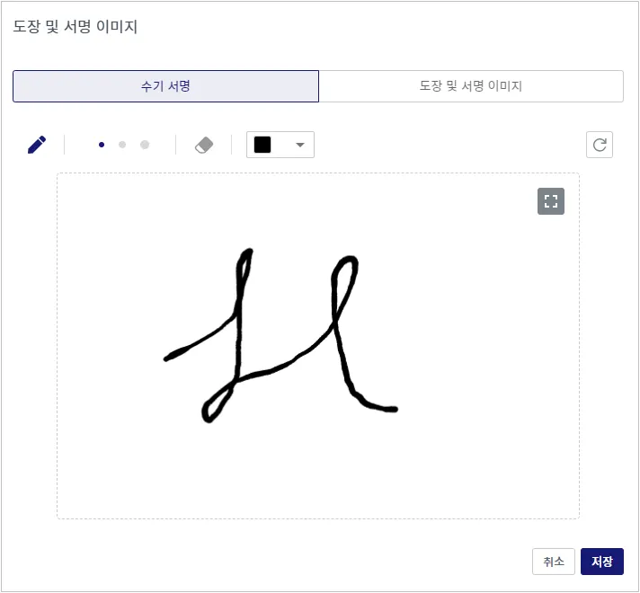 서명 입력 필드를 클릭하면 아래와 같은 도장 및 서명 이미지를 입력할 수 있는 대화 상자가 표시 됩니다. [수기 서명]으로 마우스 포인터나 모바일 기기 터치를 이용해 본인의 서명을 그려 입력할 수 있고, [도장 및 서명 이미지]에서 서명 참여자가 기존에 가지고 있던 서명, 도장 이미지 파일을 업로드하여 사용할 수 있습니다.