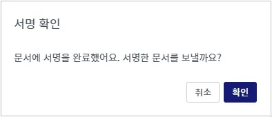 모든 필수 필드 입력이 완료되면 오른쪽 하단의 [입력 완료] 버튼이 활성화되고 해당 버튼을 클릭하면 서명 발송을 확인하는 대화 상자가 표시됩니다.