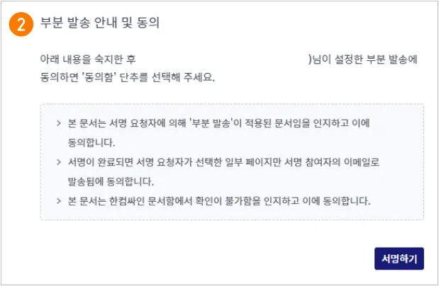 미가입 사용자의 경우, 아래 1번 이미지와 같이 [전자서명 및 문서 부분 발송] 내용에 대한 고지와 동의를 수집하고, 가입자의 경우 2번 이미지와 같이 [부분 발송 안내 및 동의] 수집 후, 서명을 진행합니다.