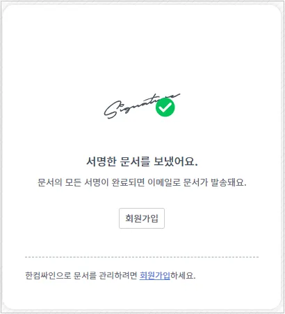 부분 발송된 서명 문서의 경우 서명 참여자는 한컴싸인 문서함에서 문서를 확인할 수 없습니다. 서명 완료 메일에서만 문서 확인이 가능하니 신중하게 보관하시기 바랍니다.