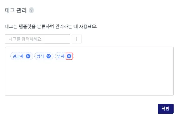 대화상자 하단 태그중 삭제할 태그 오른쪽의 ‘x’ 버튼을 누르고 [확인] 버튼을 누릅니다.