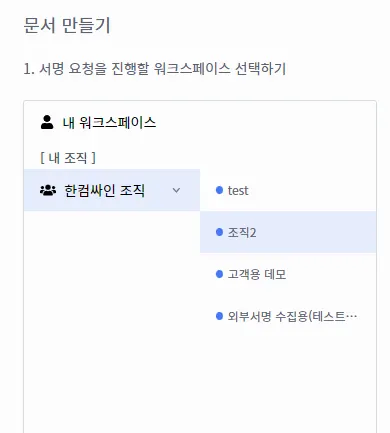 서명 요청을 진행할 워크스페이스를 선택합니다. 선택한 워크스페이스의 문서함에서 서명 요청을 확인할 수 있습니다.