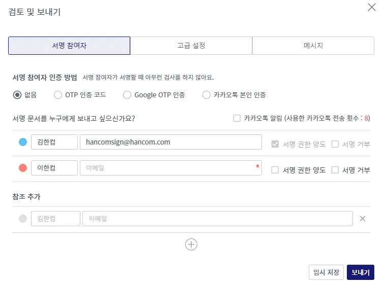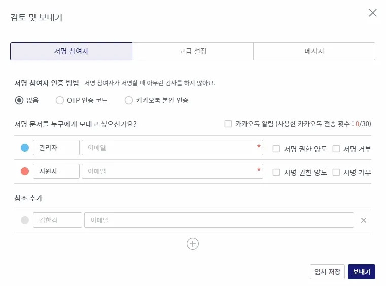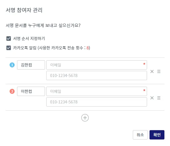 서명 참여자: [편집하기]를 눌러 [서명 참여자 관리] 대화 상자를 열고 서명 참여자를 추가하거나 서명 순서를 지정하거나 카카오톡 알림을 보낼지 여부를 선택합니다.