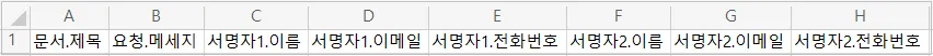 다운로드한 파일을 스프레드시트 프로그램에서 불러오기 하면 아래와 같이 첫 행에 각 필드 이름이 표시된 시트가 보입니다. 각 필드 이름별로 내용을 입력하면 됩니다. 필드 이름에 ‘자동입력값.서명자’이 입력되어 있는 필드 하단에 각 서명자 별로 변경되어야 할 값을 입력하면 됩니다.