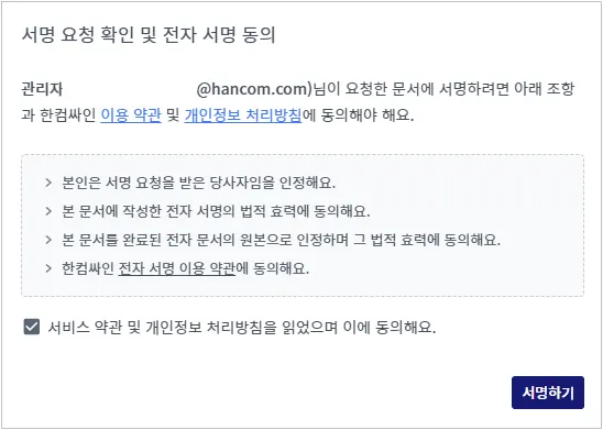 서비스 약관 및 개인정보 처리 방침에 동의함을 선택한 다음 [서명하기]를 누릅니다.