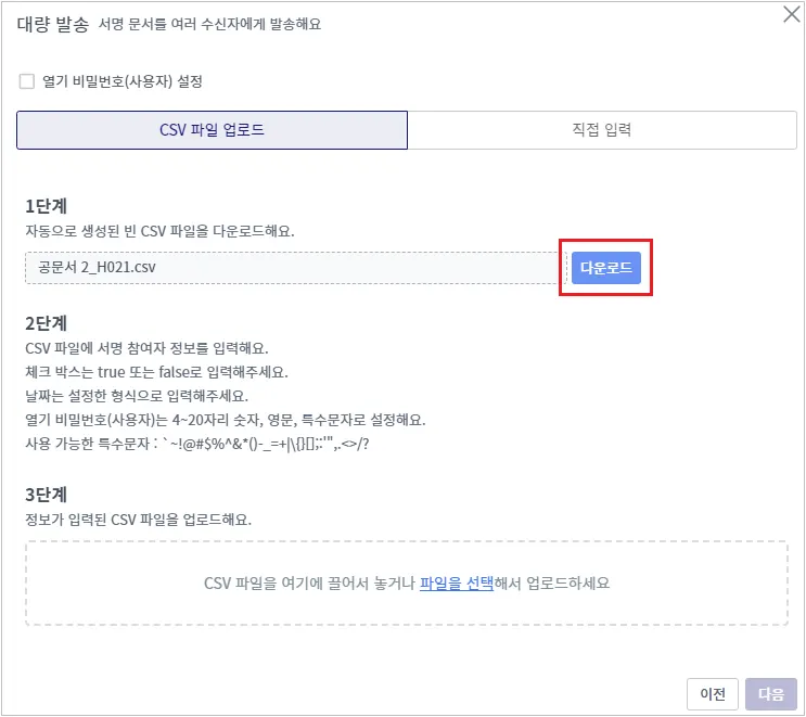 표시된 [대량 발송] 창에서 중간에 위치한 [다운로드] 파란색 버튼을 클릭하고 자동 생성되는 CSV 파일을 다운로드합니다.