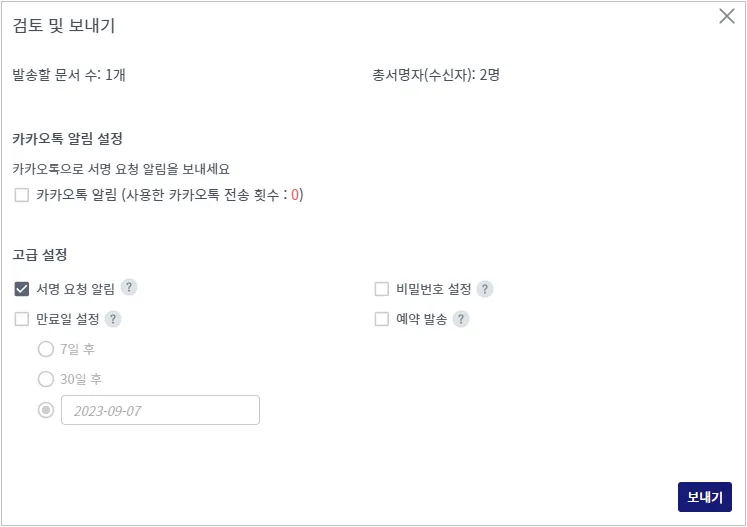 해당 창에서 [다음] 버튼을 누르면 [검토 및 보내기] 창이 표시됩니다. 이 창에서는 몇 건의 문서가 발송되는지가 표시되고 카카오 알림 톡으로 서명 요청을 보낼 건지, 서명 요청 만료일 등을 설정할 수 있습니다.