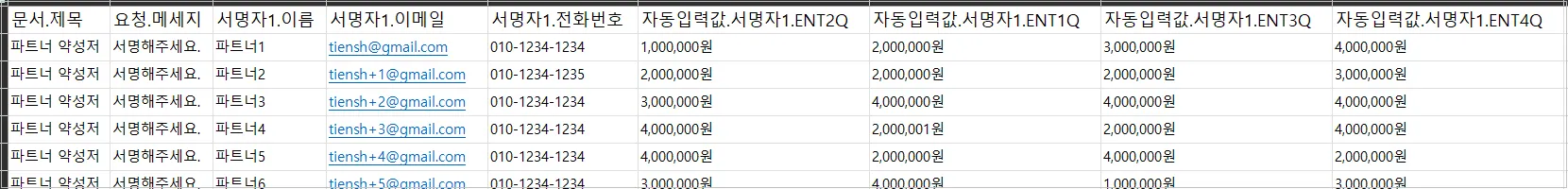 자동 입력 필드를 이용하여 서로 다른 내용의 서명 계약을 대량 전송하기