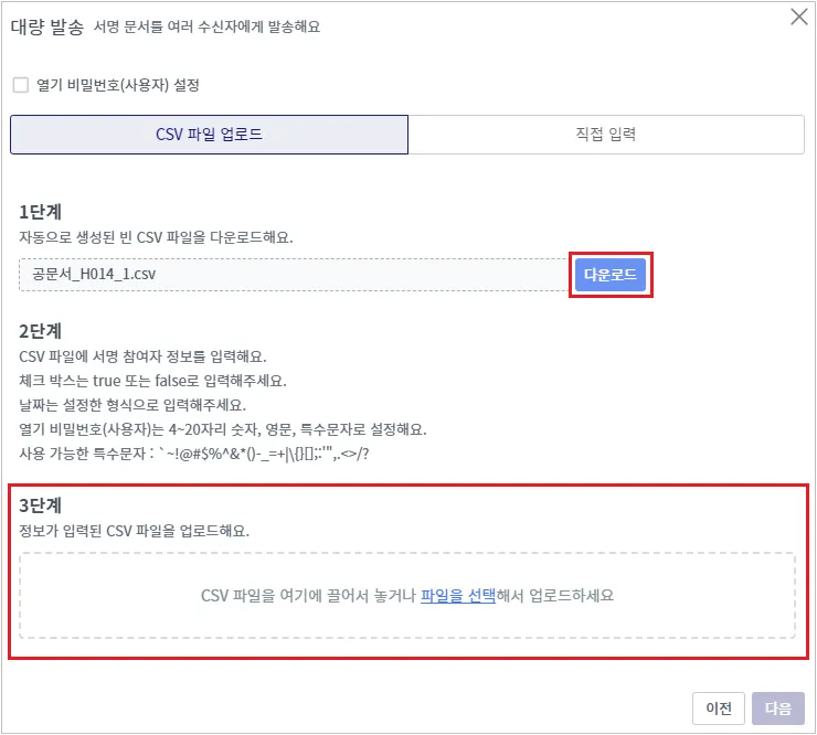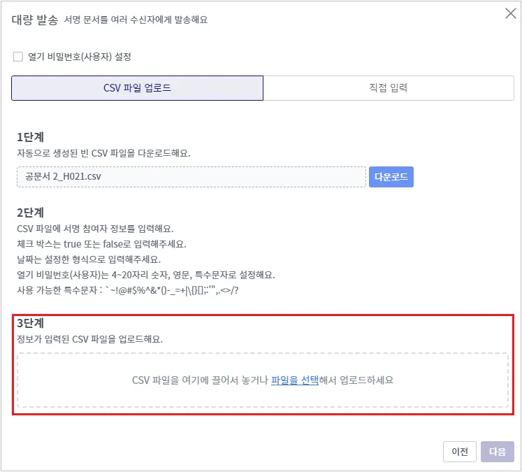 CSV 파일에 데이터 입력이 완료되면 문서를 저장한 후 한컴싸인으로 돌아와 [대량 발송] 창의 [3단계]의 [파일을 선택] 텍스트를 클릭하고 방금 저장한 CSV 파일을 업로드합니다.