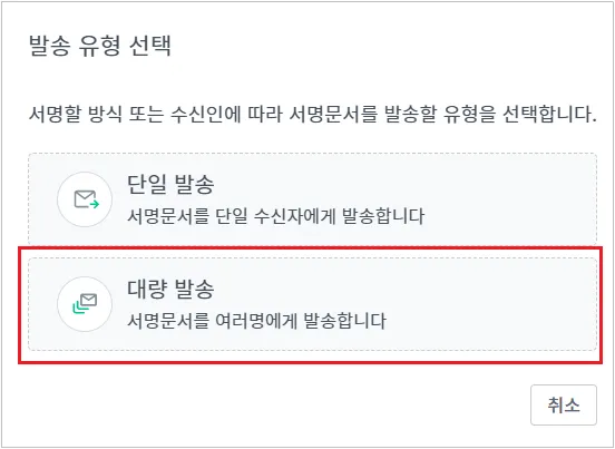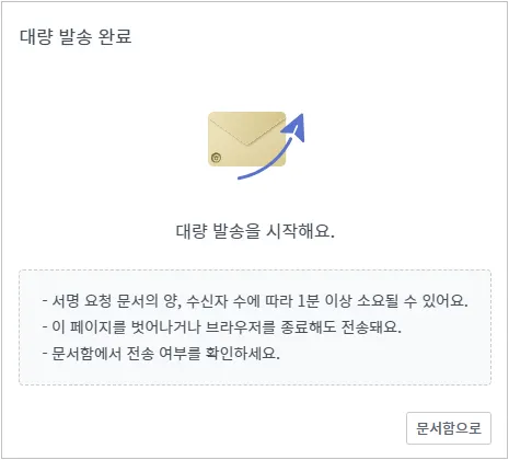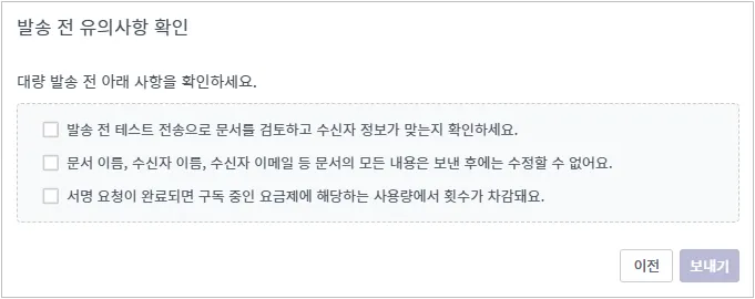 대량 발송이 시작되면 발송을 취소할 수 없으니 테스트 발송 진행 후 실제 서명자에게 발송하는것을 권유드립니다.