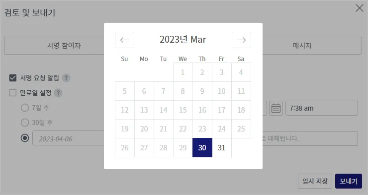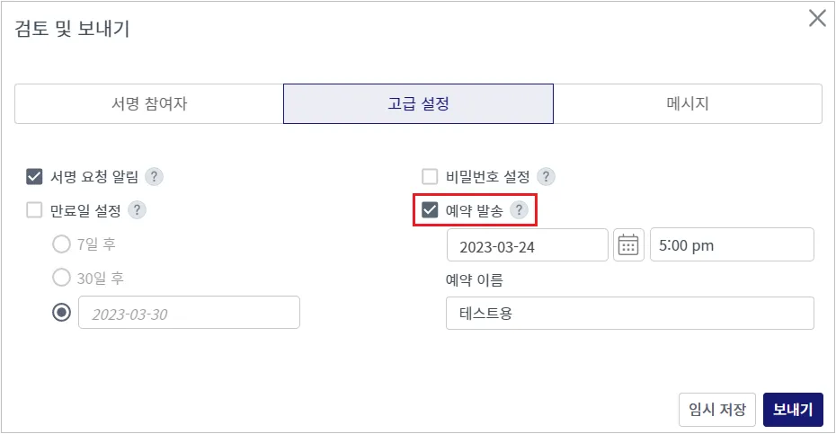 고급 설정: [서명 요청 알림]을 선택하면 서명 요청을 보낸 지 2일 및 6일이 경과하면 각각 알림을 보냅니다. [만료일 설정]에서 서명 요청이 만료되는 날짜를 지정할 수도 있습니다. 아울러 비밀번호 또는 예약 발송도 설정할 수 있습니다.