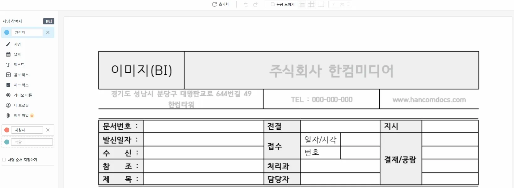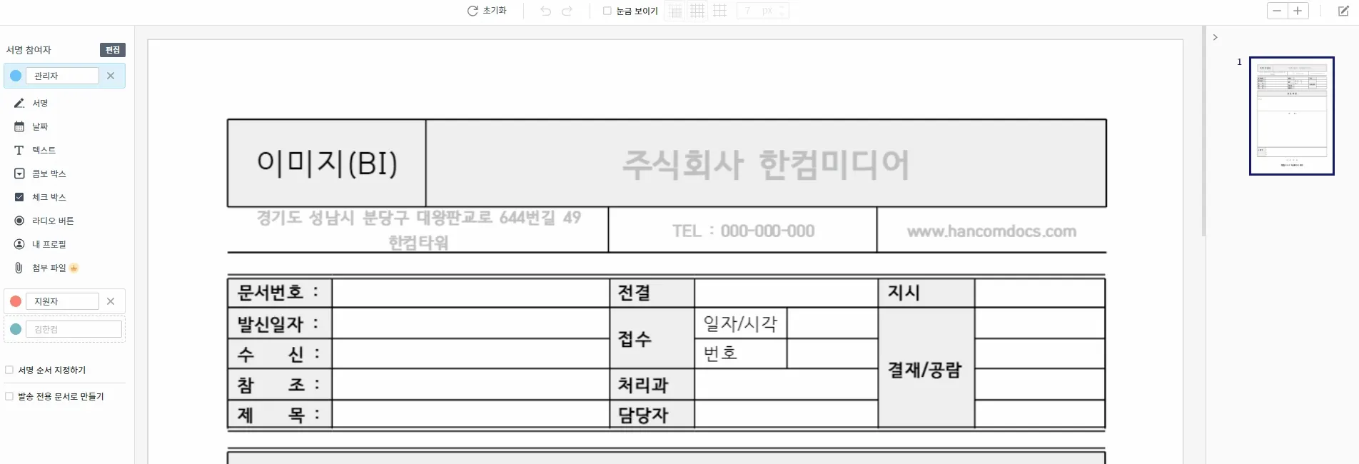편집 화면에서 필요한 항목을 편집합니다. 먼저 왼쪽 메뉴 목록에서 [서명 참여자] 항목의 [편집하기]를 눌러 서명 참여자를 관리합니다.