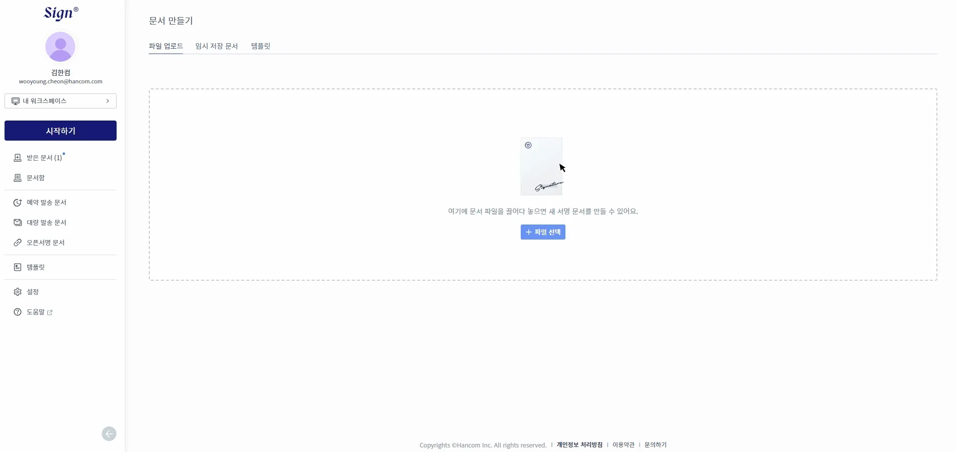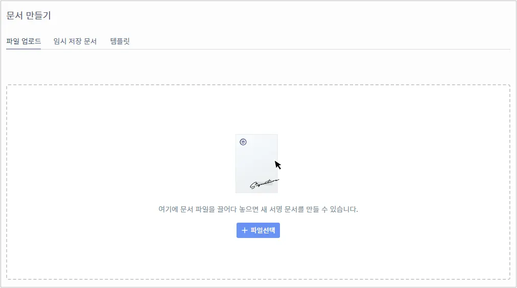 [파일 업로드] 탭에서 [+ 파일 선택]을 누르거나 로컬 드라이브의 파일을 끌어다 놓습니다. 해당 문서가 서명 가능한 문서로 자동 변환됩니다.