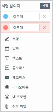 화면 왼쪽에 있는 [서명 참여자] 영역에서 서명자 이름을 입력합니다. 양식 필드는 서명자별로 추가할 수 있으며 색상으로 구분됩니다.