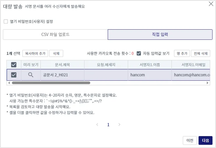 대량 전송 완료 후 아래 이미지와 같이 각 서명자별 CSV 파일 데이터가 미리 입력되어 표시됩니다.