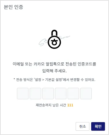 본인 인증을 위해 코드 입력을 요청하는 대화 상자가 나타납니다.