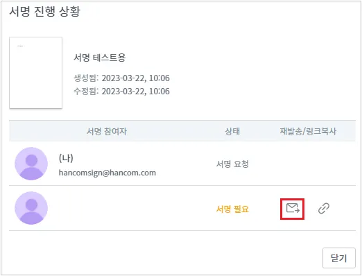 [서명 진행 상황] 대화 상자에서 아직 서명을 완료하지 않은 사용자의 오른쪽에 표시되는 [재발송](이메일 모양)을 누릅니다.