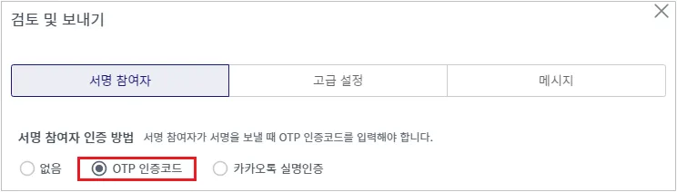 [검토 및 보내기] 대화 상자의 [서명 참여자 인증 방법]에서 [OTP 인증코드]를 선택합니다.
