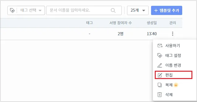 템플릿으로 등록한 문서의 양식 필드 또는 사용자 정보를 수정할 수 있습니다. 편집할 템플릿을 선택하고 [관리]의 [더 보기(…)] 아이콘을 누른 다음 [편집]을 누릅니다. 그러면 서명자, 양식 필드, 레이블 등을 수정할 수 있는 편집 모드로 전환됩니다.