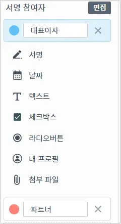 왼쪽 메뉴 목록에서 [서명 참여자] 항목의 [편집]를 눌러 서명 참여자를 관리합니다.