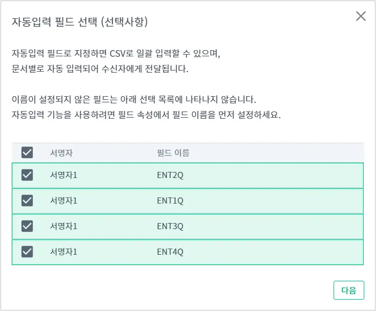 다음으로 표시되는 [자동 입력 필드 선택]에서 아까 템플릿에서 필드 이름을 지정했던 모든 필드를 선택하고 [다음] 버튼을 클릭합니다.