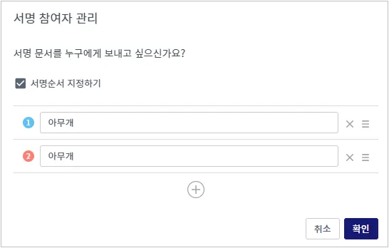 [서명 참여자 관리] 대화 상자에서 [+]를 눌러 서명자를 추가하고 서명 순서를 지정한 다음 [확인]을 누릅니다.