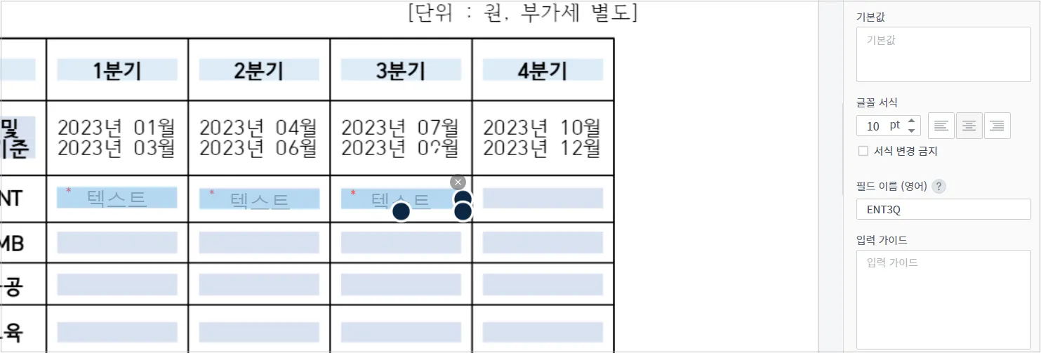 숫자나 가격의 값을 자동으로 입력할수 있게 하려면 텍스트 필드를 선택하면 됩니다. [텍스트]를 클릭한 후 자동 입력 값이 표시될 부분에 드래그 앤 드롭(Drag&Drop)으로 삽입, 크기 조절 등이 가능하며, 동일한 속성/크기의 필드를 연속해서 삽입하려면 복사 후 붙여넣기를 하면 됩니다.