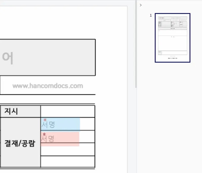 문서에서 서명 필드를 추가할 곳에 마우스 포인터를 올려 놓고 마우스 오른쪽 단추를 누릅니다. 서명 필드가 추가됩니다.